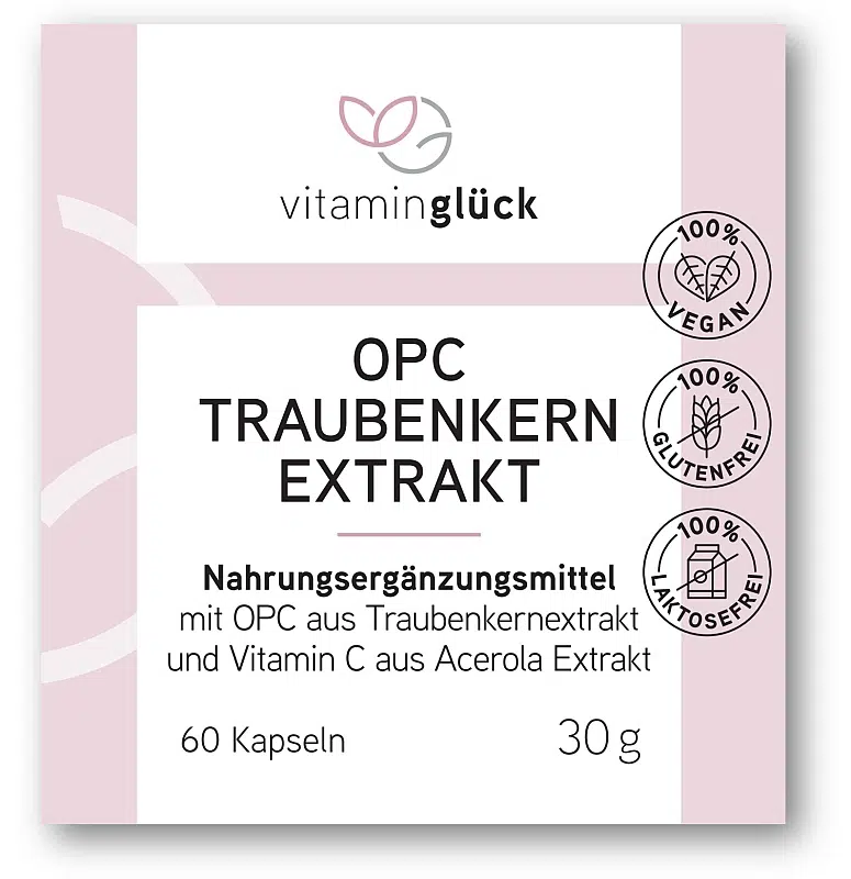 OPC Traubenkern Extrakt enthält neben hoch dosiertem OPC aus Traubenkern Extrakt auch einen Extrakt aus der Acerolakirsche mit wertvollem Vitamin C.