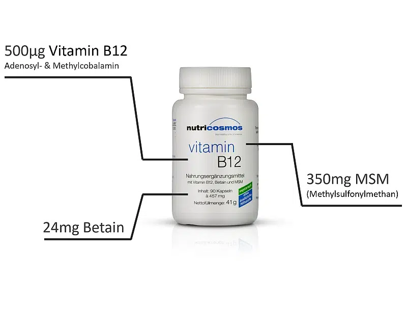 Methylsulfonylmethan (MSM) Pulver, Hydroxypropylmethylcellulose (Kapselhülle), Betain-Hydrochlorid, 5`- Desoxyadenosylcobalamin, Methylcobalamin.