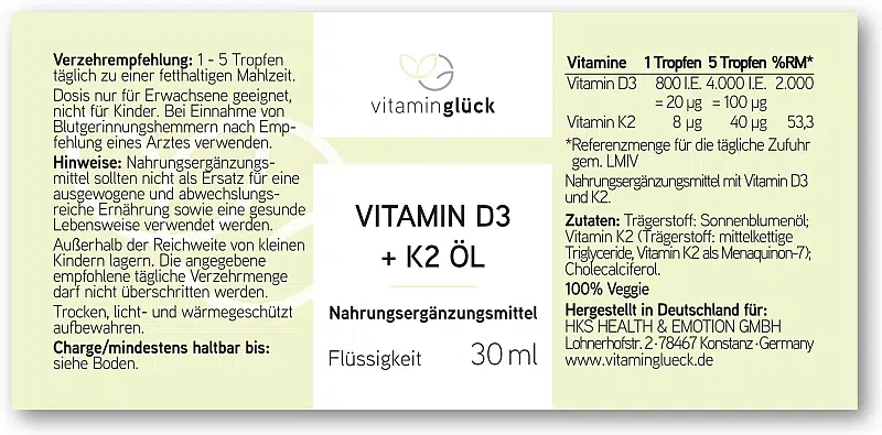30 ml vegetarisches Öl mit einer sinnvollen Kombination von Vitamin D3 und K2.